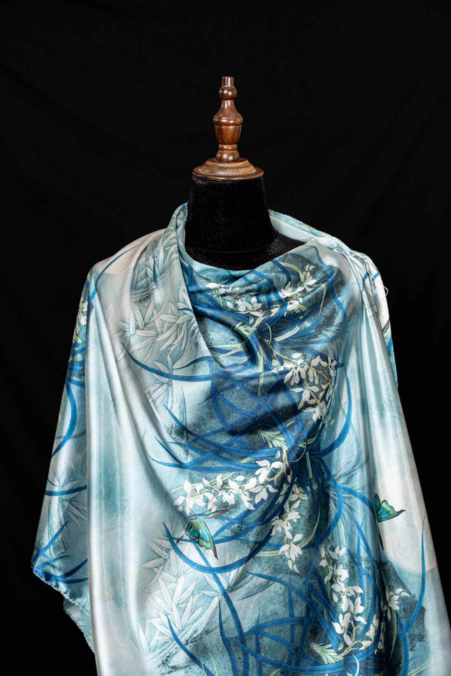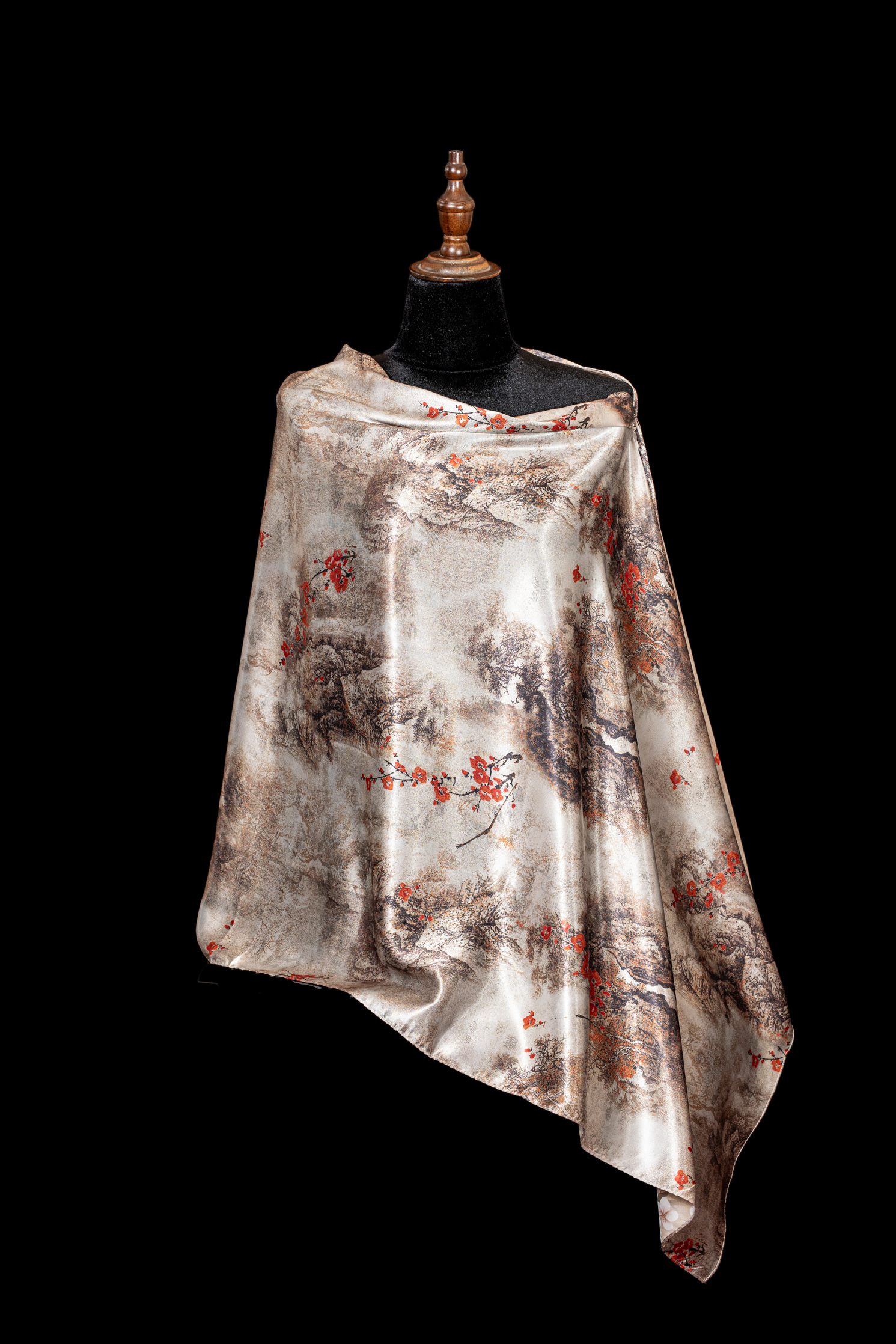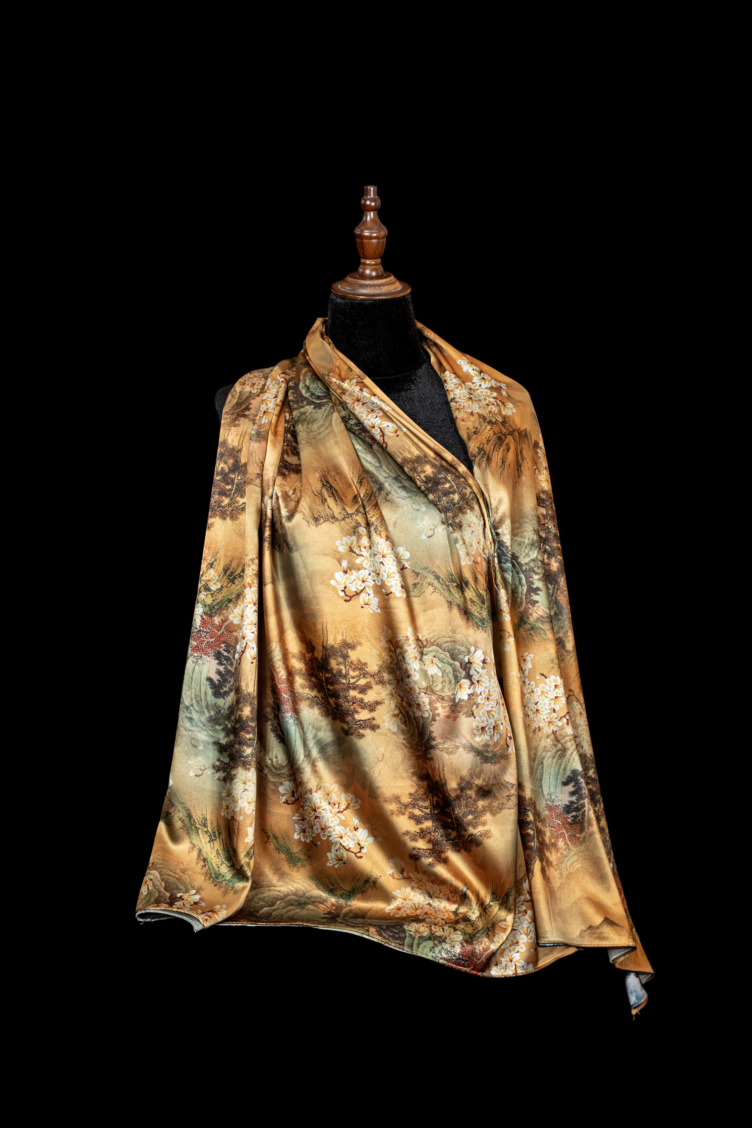 Khăn choàng Đại Lâm Mộc mang tinh thần mộc bản và vẻ đẹp trầm lắng, gợi nhắc sự giao hòa giữa con người và thiên nhiên. Trên nền chất liệu được xử lý tinh tế, sản phẩm thể hiện phong thái điềm đạm, sang trọng nhưng không phô trương, phù hợp với lối sống thanh lịch và sâu sắc.