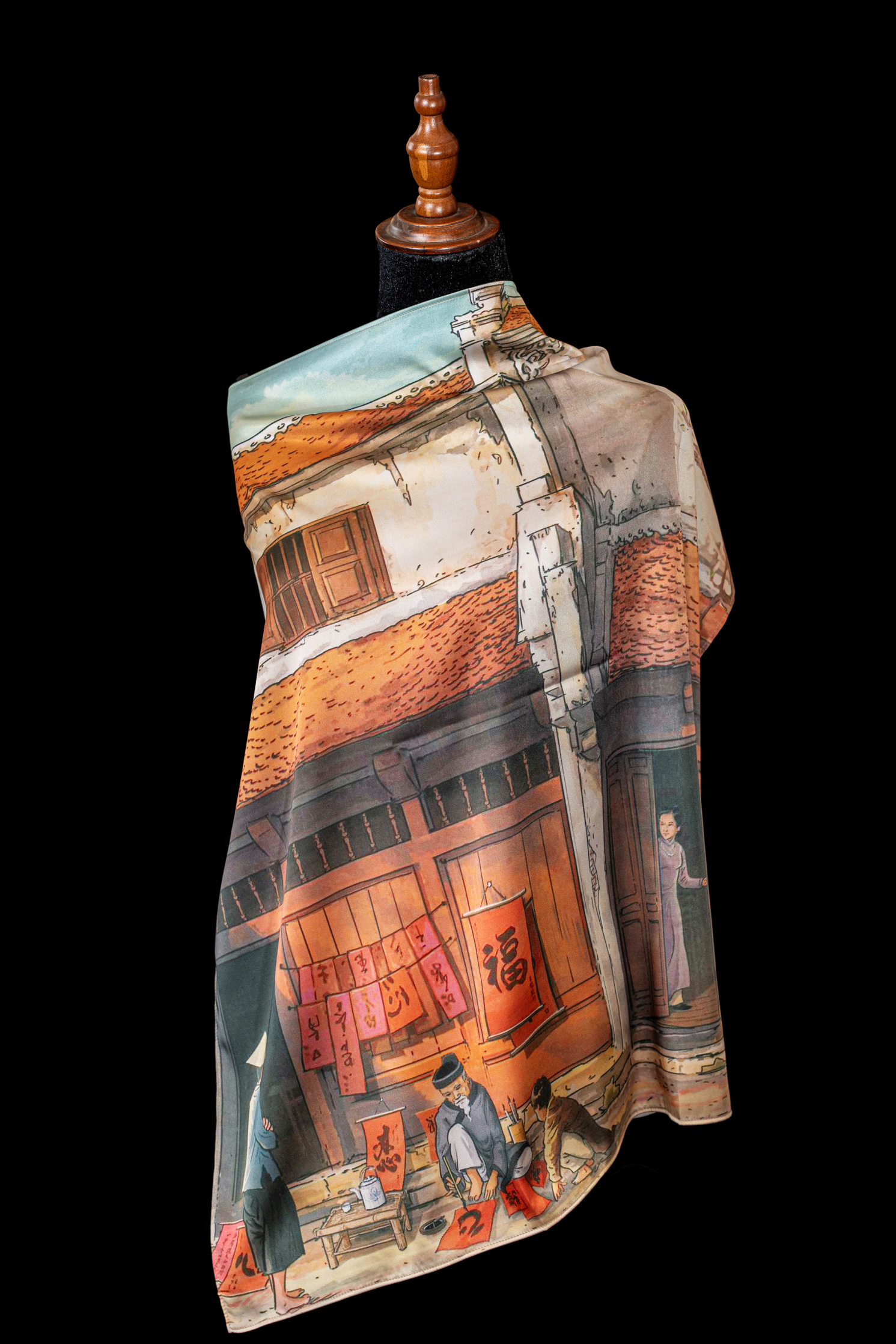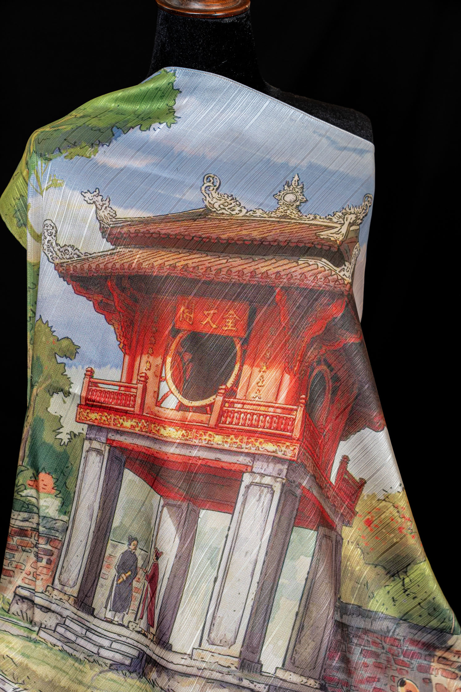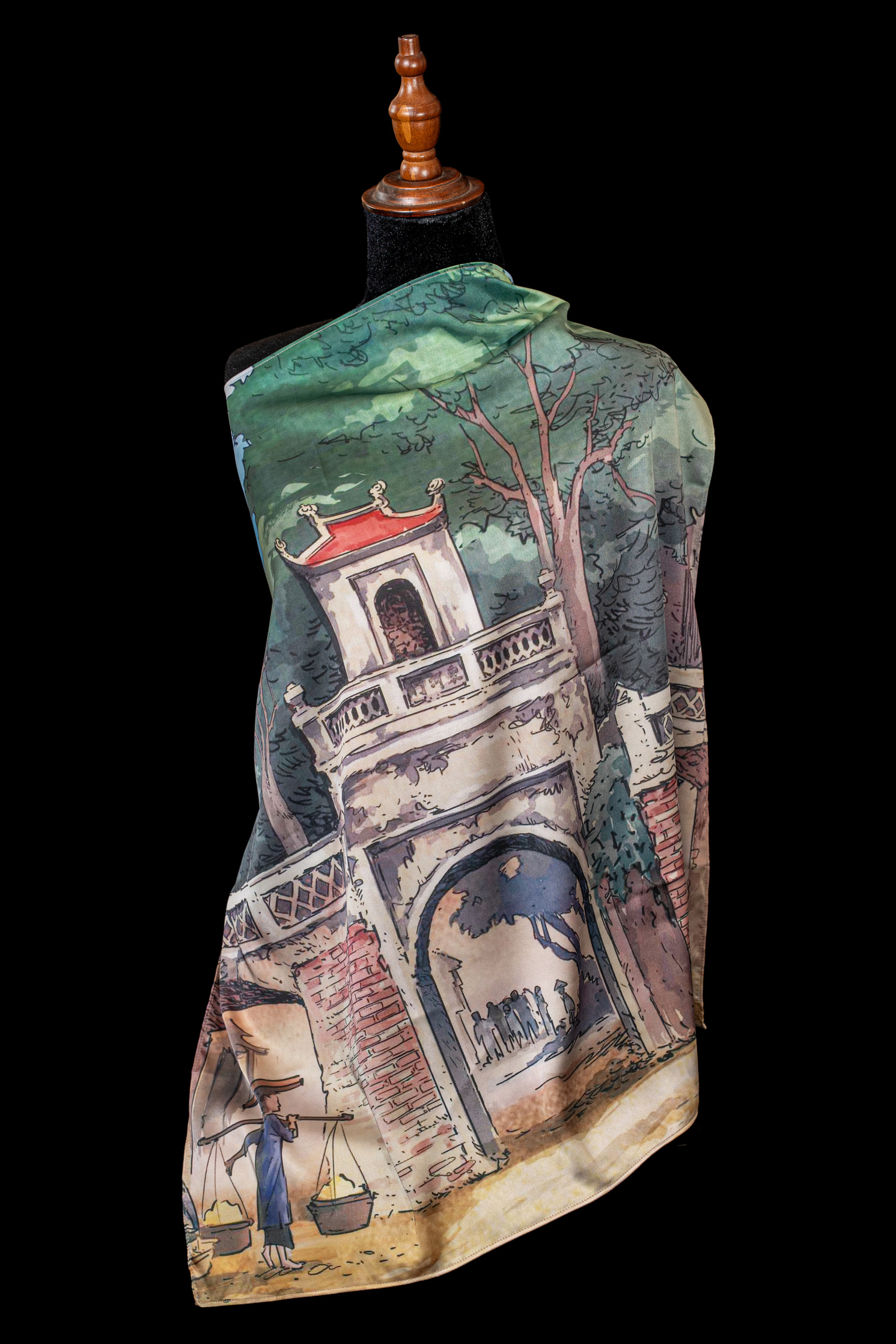 BST Khăn quàng cổ Việt Nam và Hà Nội xưa mang đến vẻ đẹp hoài niệm thông qua những họa tiết tái hiện phố cổ, mái ngói rêu phong, tà áo dài và nhịp sống thanh bình của một Hà Nội trầm mặc. Trên nền lụa mềm 70 × 70 cm, nét đẹp văn hóa Việt được khắc họa tinh tế, tạo nên một phụ kiện không chỉ để diện mà còn để gìn giữ ký ức.